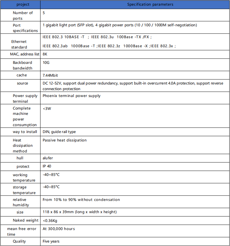 USR-ISG104-SFP is an industrial-grade Ethernet switch launched by You Man Networking Technology Co., LTD., equipped with 1 gigabit SFP optical port and 4 10/100/1000MBase-T adaptive electrical port, the product has the operating temperature of -40℃ ~ 85℃, with strong robustness to adapt to a variety of stringent environments. Rail installation features, wide temperature operation, to provide reliable and convenient solutions for the user's Ethernet equipment networking to meet the deployment requirements of rail transit, safe city, intelligent transportation, security monitoring and other harsh environments, to provide reliable and convenient solutions for the user's Ethernet equipment networking.