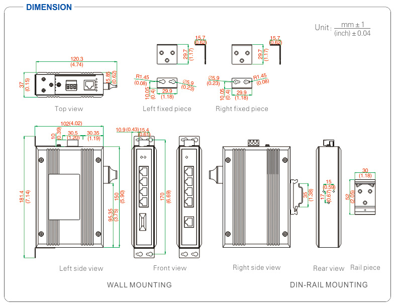 - 5x10/100Base-T(X) ports, with optional 4 100M Ethernet ports and 1 fiber port